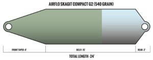 The next line in order of popularity is the Scandi head. The key difference with a Skagit head is that the tapers on these shooting heads are longer. That creates a shooting head that is more stable in the air. Tighter loops and greater speeds can be generated. The longer front tapers also make airborne or “touch-and-go” casts easier to execute. Generally the are much lighter than Skagit heads. They are not as good at lifting heavy sink tips out of the water and turning over very big flies, as Skagit heads are.