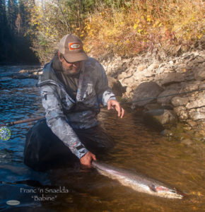 A fish caught on a classic Skagit setup; Burkheimer #8 13’4″ with Guideline 500 grain Skagit head and 15′ of T14